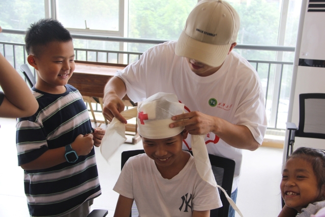在智能小车的科普环节中,团队成员以PPT讲解的形式,通过形象的图片与视频向小朋友们介绍了智能小车的基本结构、工作原理,以及智能小车在生产生活中的应用和对社会发展的作用。在队员的操作下,智能小车现场进行了“自主巡线行驶”,“蓝牙操控行驶”等表演,并用单片机实现了红绿灯、时钟的功能,深受小朋友们的欢迎,为了满足他们的好奇心和求知欲,队员们亲自指导和帮助小朋友们进行实践操作,亲身、近距离感受科技的奥秘与神奇。在急救知识学习环节中,队员亲自演示紧急情况下的处理方法,小朋友们认真的观看学习并亲自操作各种包扎技巧。