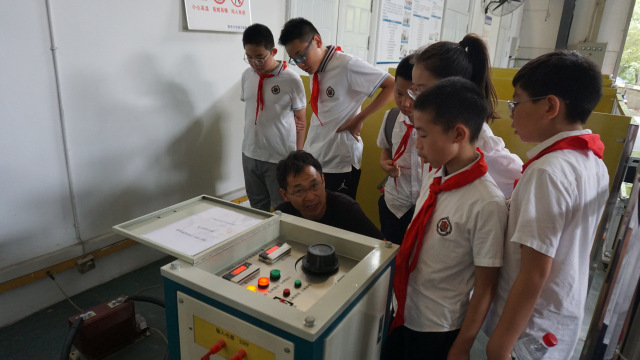 活动伊始,小学生们在任晓老师的引导下,来到内燃机实验室附近的厂房参观了微电网模拟沙盘和高压设备。老师们耐心地为小学生们讲解了这些设备的原理和工作方式,并让他们亲手操作了一些简单的实验设备,感受新能源的魅力和科技的力量。