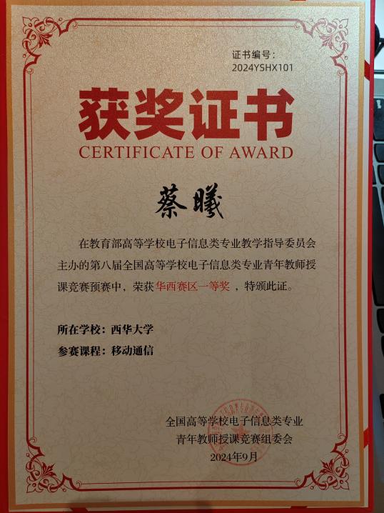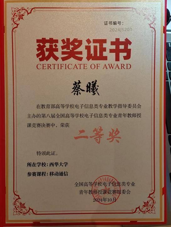 蔡曦老师是我校电气与电子信息学院的一名优秀青年教师,工学博士,担任本科生《无线通信原理与移动网络》、《数字信号处理B》、《工程管理与经济决策》以及研究生《现代数字通信》等课程的教学工作。他不仅在本次授课竞赛中取得了优异成绩,还曾获得西华大学第八届青年教师讲课比赛二等奖,主持并参与校级教改项目多项,参与录制“新华思政”案例课程(数字信号处理),公开发表论文和专利十余篇,指导学生获得国家/省级学科竞赛多项荣誉,并通过ISW教学技能水平认证。