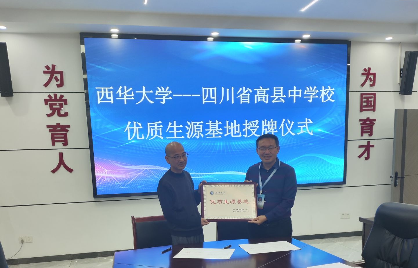 1015日下午,西华大学-宜宾高县中学优质生源基地在高县中学会议室举行。西华大学电气与电子信息学院教师陈立功、罗彦、辅导员康濛,高县中学党委书记廖强、部分校领导、中层干部参加授牌仪式。