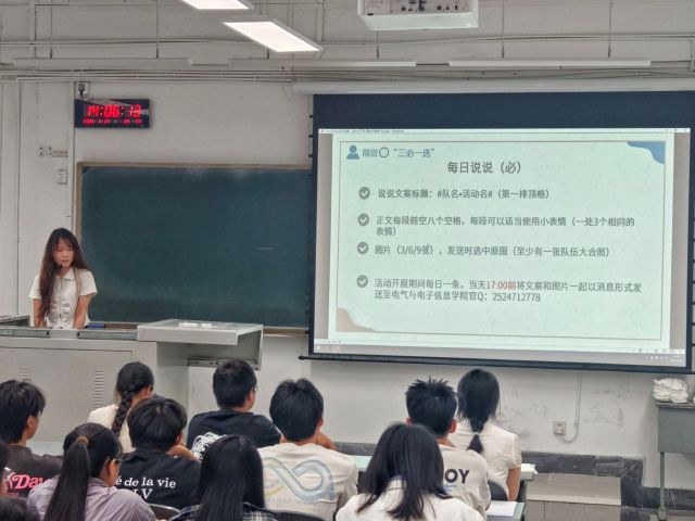 本次大会共有五个环节,首先是由组织建设部的常震岳进行安全宣讲,强调在活动中应当注意的事项,让同学们安全地进行活动。然后是新媒体中心的杨乐进行宣传宣讲并对活动所需要提交的东西进行说明和要求,并为同学们提供了视频,推文,照片等的处理方法,让同学们可以更好地完成工作。紧接着,由团队优秀代表王思程进行经验分享,为大家提供了宝贵的经验和应对问题的方法。
