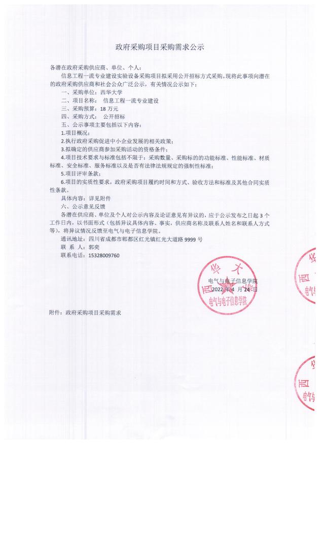 政府采购项目采购需求公示(货物类):信息工程一流专业建设(公示期:2022.4.24-4.26)