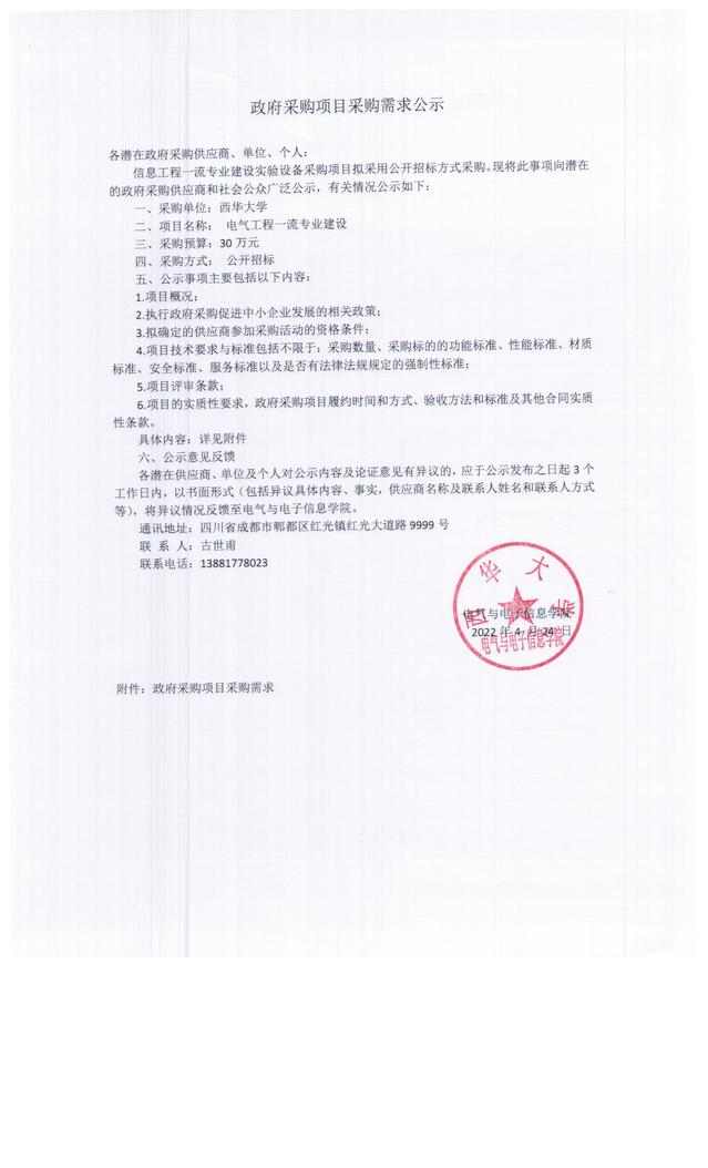 政府采购项目采购需求公示(货物类):电气工程一流专业建设(公示期:2022.4.24-4.26)