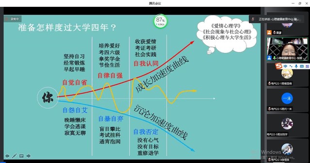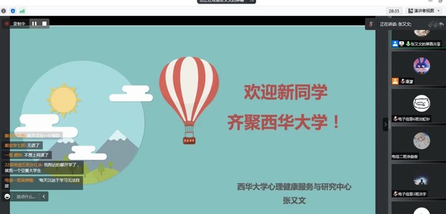 为帮助2022级新生更好适应大学生活,电气与电子信息学院于9月8-9日,举办了四场线上心理健康讲座,分别由心理健康服务与研究中心的王文娟、綦越、王中瑞、张又木老师主讲,2022级宜宾校区和校本部的全体本科和研究生线上参加。