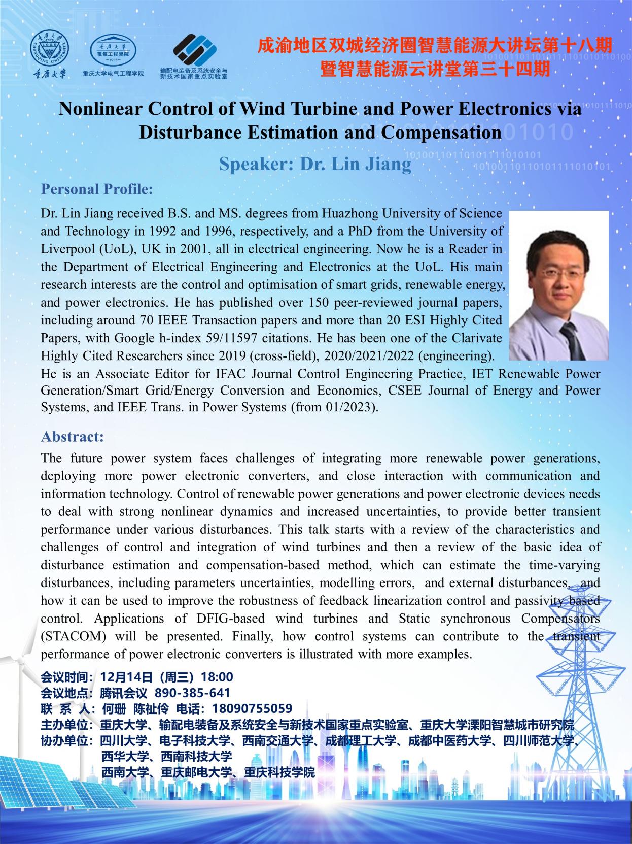 Dr.Lin Jiang received B.S. and MS. degrees from Huazhong University of Science and Technology in 1992 and 1996, respectively, and a PhD from the University of Liverpool (UoL), UK in 2001, all in electrical engineering. Now he is a Reader in the Department of Electrical Engineering and Electronics at the UoL. His main research interests are the control and optimization of smart grids, renewable energy and power electronics. He has published over 150 peer-reviewed journal papers, including around 70 IEEE Transaction papers and more than 20 ESI Highly Cited Papers, with Google h-index 59/11597 citations. He has been one of the Clarivate Highly Cited Researchers since 2019 (cross-field), 2020/2021/2022 (engineering).He is an Associate Editor for IFAC Journal Control Engineering Practice, IET Renewable Power Generation/Smart Grid/Energy Conversion and Economics, CSEE Journal of Energy and Power Systems, and IEEE Trans. in Power Systems (from 01/2023).