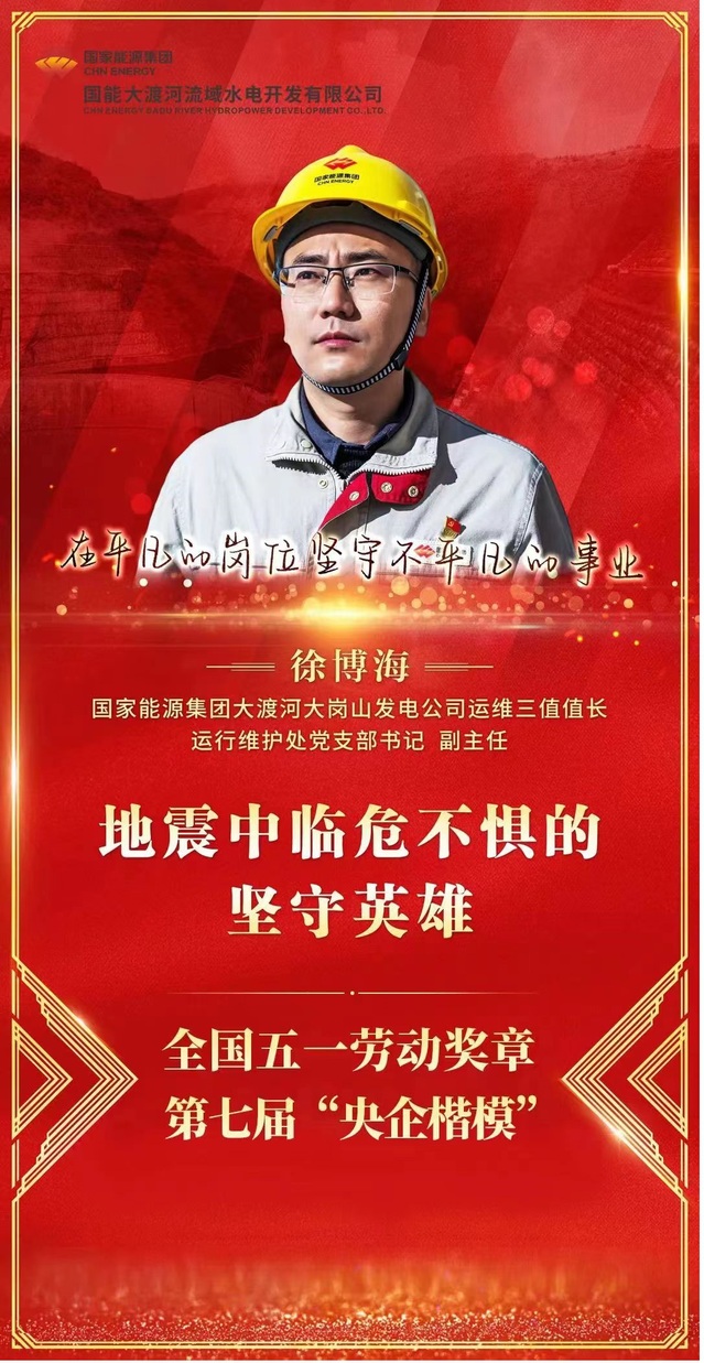 在2022年9月5日四川甘孜州泸定县发生6.8级强震中,徐博海作为当班值长选择用生命坚守,逆行冲进应急值守室,带领所在运维三值现场值守人员沉着冷静开展应急处置,冒着余震风险开展开关站、GIS楼到厂房、大坝检查,积极参与营地供电和供水恢复处置工作,有效的保障了大岗山电站在震后的安全稳定运行,并出色完成了应急抢险任务,保障了电站安全生产和稳定发电,彰显了央企一线职工的敬业担当和对事业的忠诚,以人在岗在的坚定承诺践行了一名共产党员的铮铮誓言。