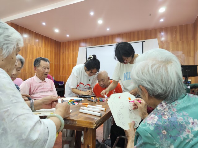 7日,实践团成员们前往成都市青孝颐养中心,拜访在养老院居住的老人。成员们帮忙打扫养老院卫生,在养老院工作人员的协同下一起帮助爷爷奶奶们对扇子进行简单的上色,为老人们献上精心准备的歌曲。在聊天时,老人们纷纷感谢如今社会对于老年人的关怀,感叹生活质量的不断提高。